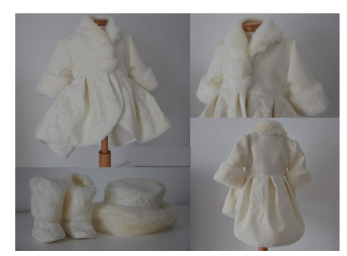 Paltonas de botez bebelusi/fetite ivoire din blanita si stofa, setul include paltonas cu trena si aplicatii dantela, palarie si cizmulite asortate.